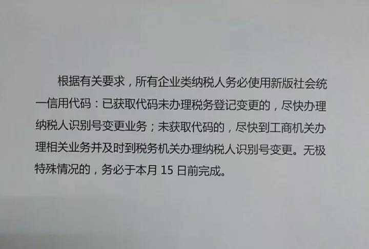 按照国家税务总局要求,原有企业类纳税人需要在2017年年底前将15位税务登记号变更为“五证合一”后18位统一社会信用代码。