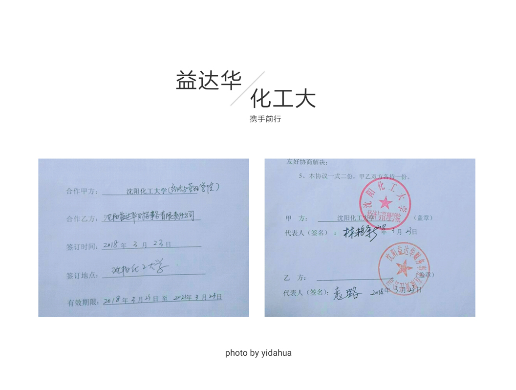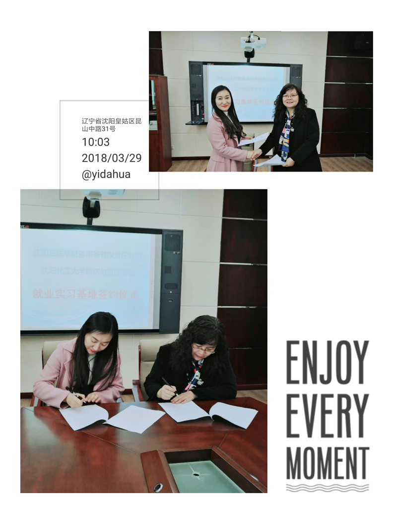3月23日,沈阳益达华财务事务有限责任公司和沈阳化工大学校企合作签约仪式,沈阳益达华财务事务有限责任公司2018年第一期“沈阳化工大学就业实习基地”在沈阳化工大学举行。